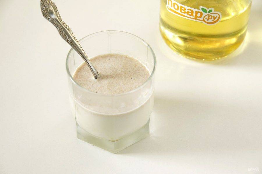 В теплое молоко добавьте сахар и перемешайте, чтобы он полностью растворился. Добавьте 1 ст. л. муки и дрожжи. Перемешайте и оставьте в теплом месте, пока не появится дрожжевая шапочка.