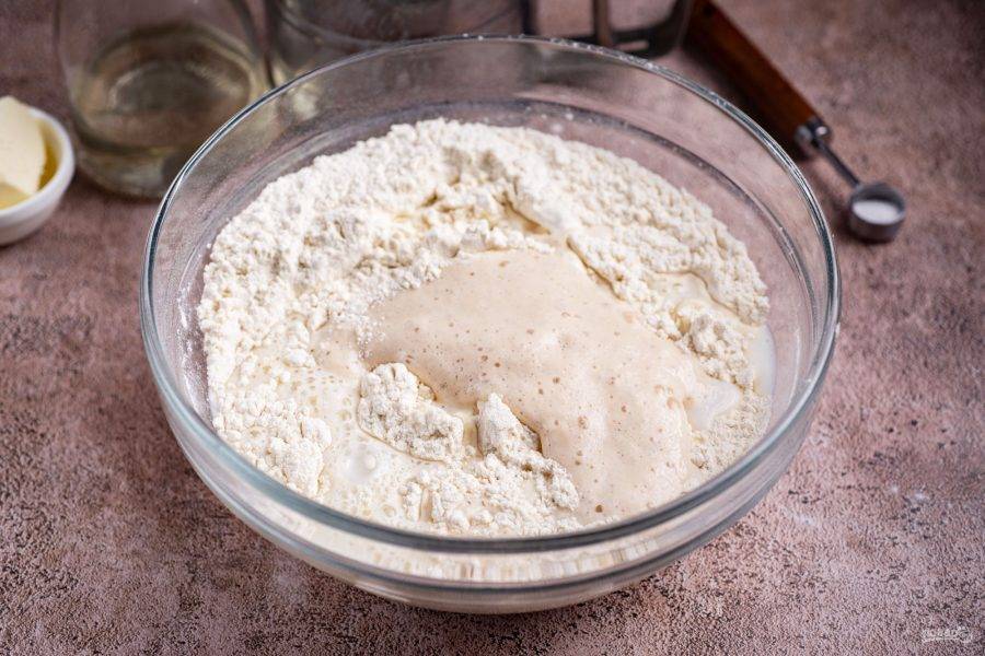 В просторную миску просейте муку, добавьте сахар. Перемешайте.