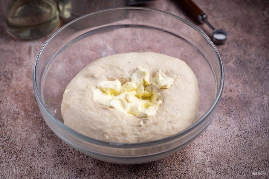 Замесите тесто и добавьте к нему мягкое сливочное масло. Вмешайте его в тесто и продолжайте замес руками - я вымешивала примерно 10 минут. По ходу процесса немного добавляйте муки, если необходимо, но не забивайте тесто мукой.