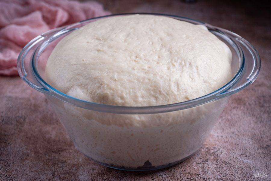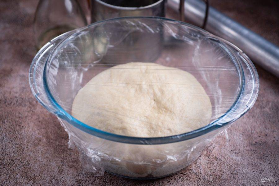 В итоге тесто должно получиться мягким и гладким. Округлите тесто в миске и затяните миску пищевой пленкой. Оставьте в теплом месте на кухне тесто подходить примерно на 3 часа.