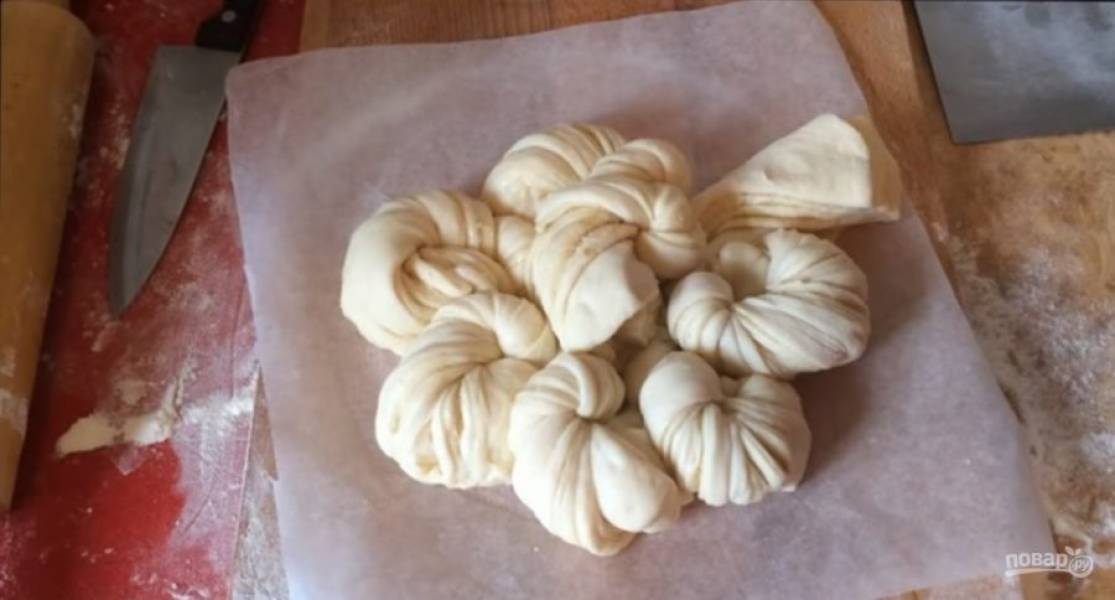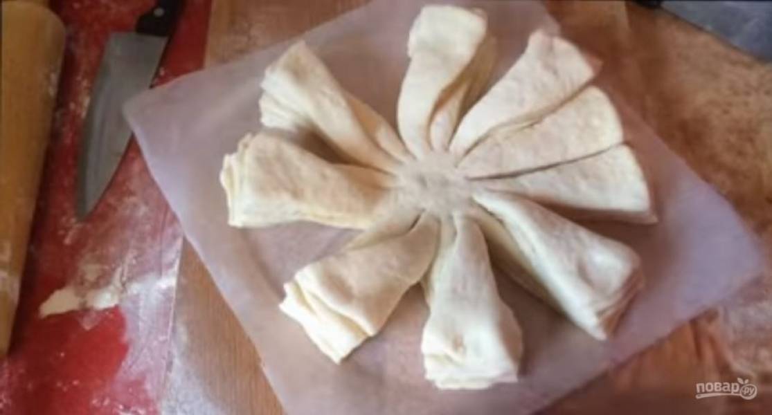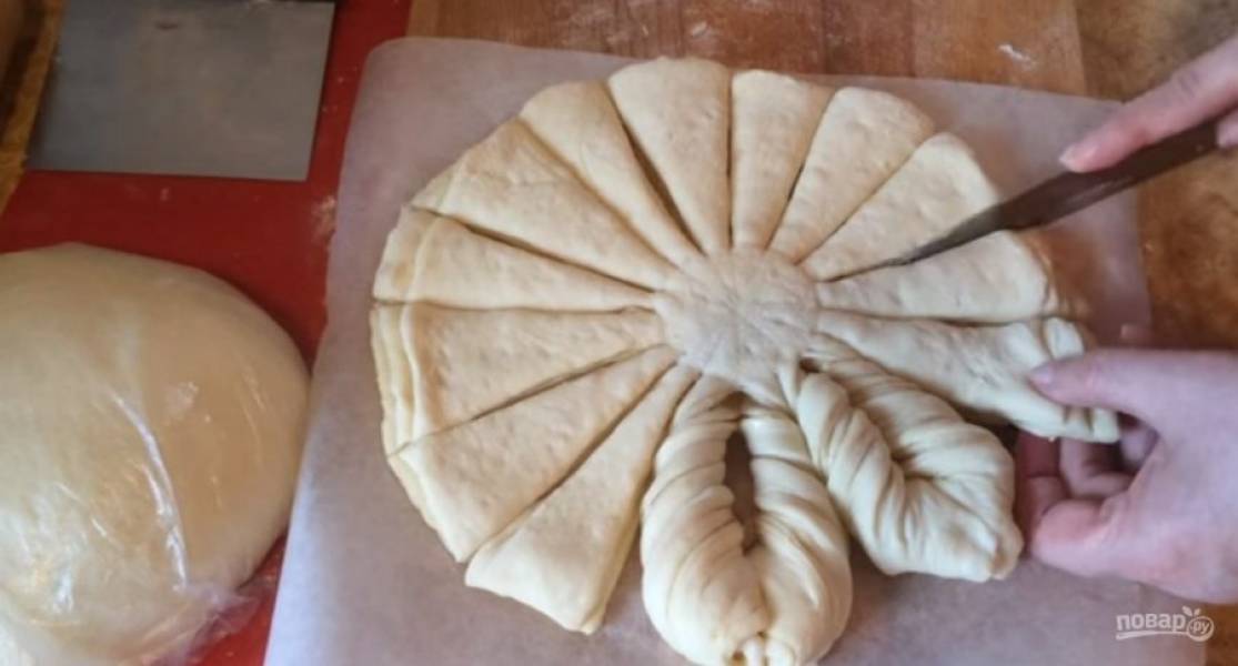 Острым ножом разрежьте пирог по разметке на 16 частей. Затем возьмите две соседние полоски и перекрутите их в противоположные стороны три раза. Закрепите концы так, чтобы получилась овальная форма.