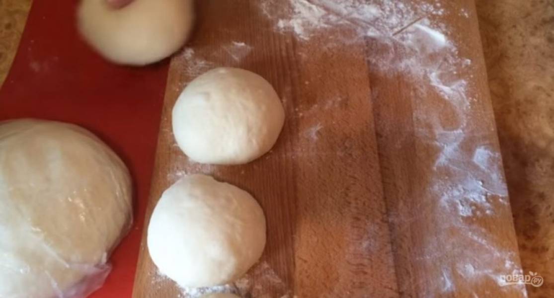 Сдобное тесто разделите на две равные части и каждую часть округлите. Одну часть накройте пленкой и отложите. Оставшееся тесто разделите на четыре части, каждую округлите и подкатайте в колобок.