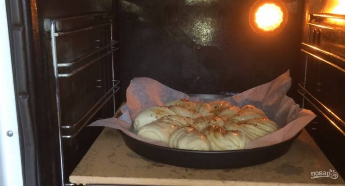 Посыпьте пирог тростниковым сахаром, перенесите на бумагу для выпечки и накройте пленкой. Оставьте на 30 минут при комнатной температуре. Смажьте пироги взболтанным яйцом и отправьте в разогретую до 180 градусов духовку на 30-35 минут.