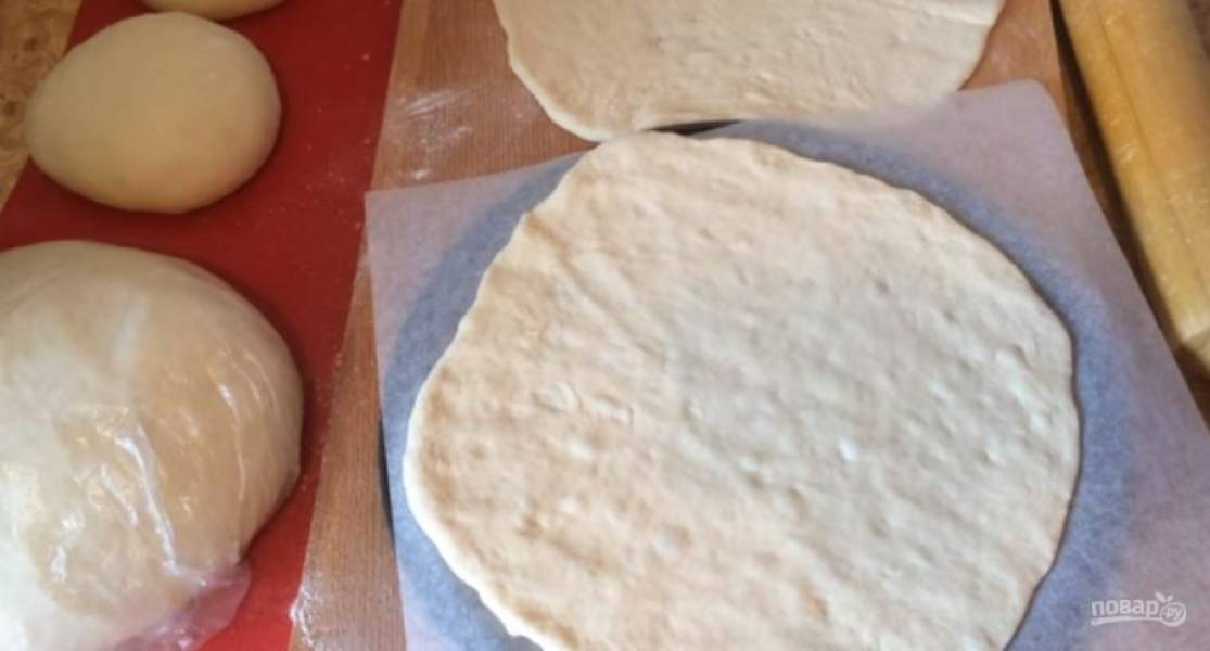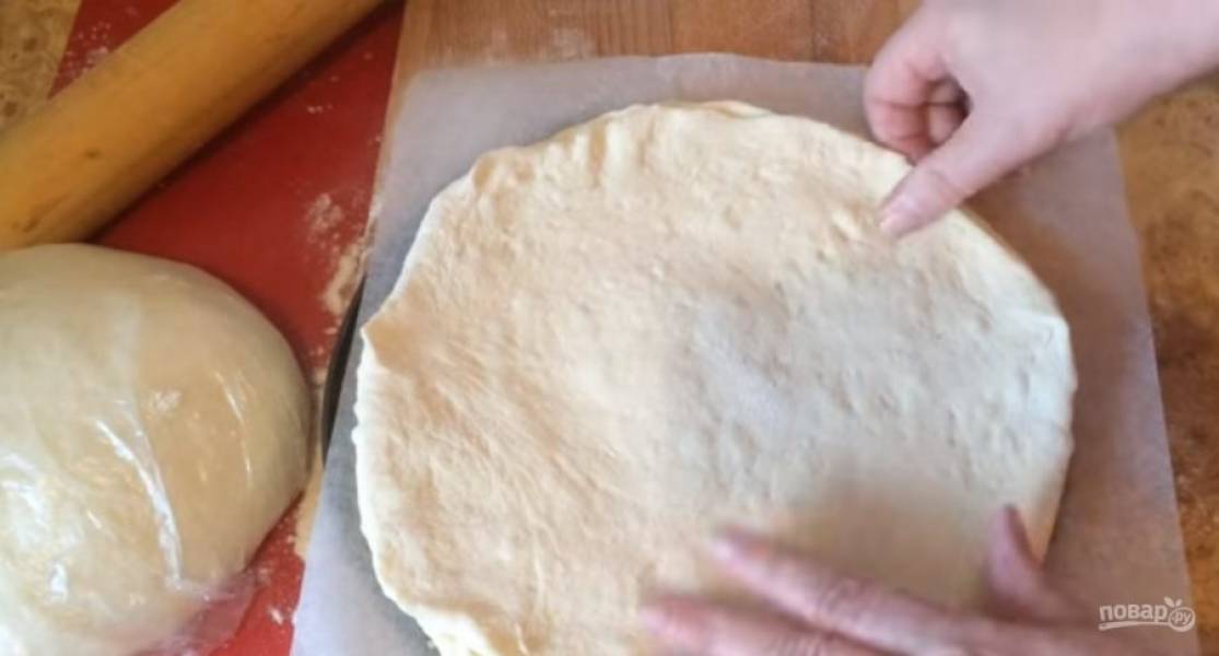 Раскатайте один шарик в тонкую лепешку и выложите на круглую поверхность, размером с будущий пирог, застеленную бумагой для выпечки. Лепешку смажьте оливковым маслом и равномерно распределите несколько ложек сахара.