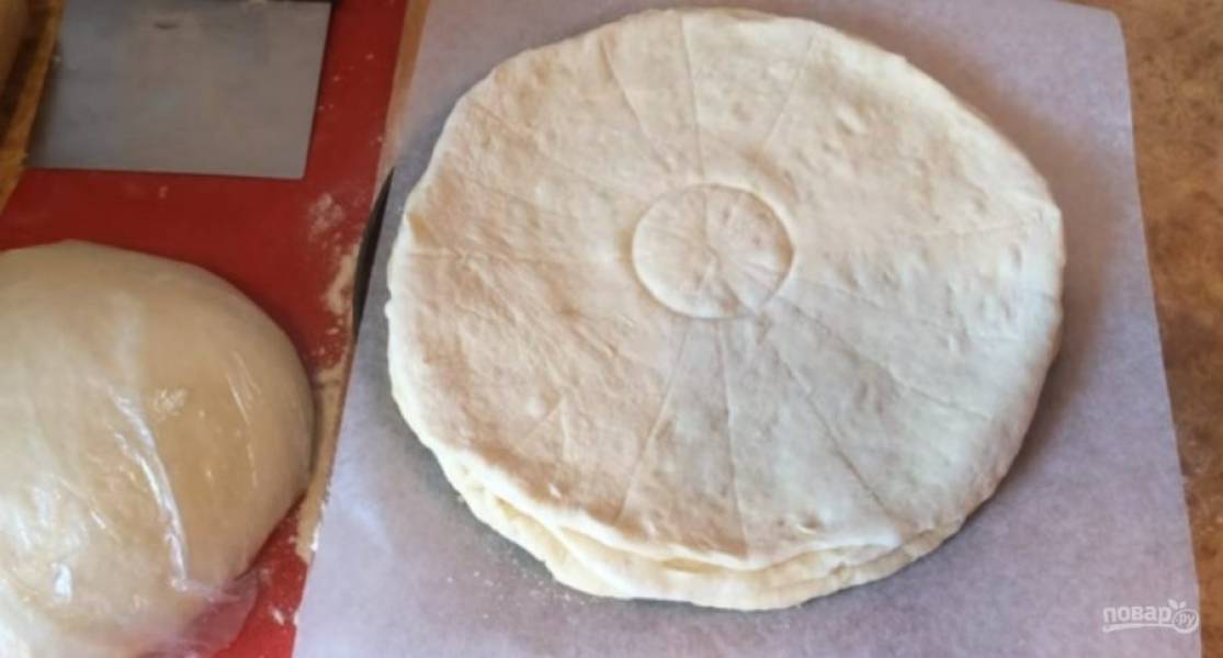 Подровняйте его с остальными коржами, смажьте оливковым маслом, посыпьте сахаром и выложите сверху четвертый пласт. Разметкой разделите верхнюю лепешку на 16 частей, а стаканом наметьте по центру круг, который не нужно будет разрезать.