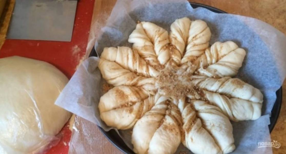 Возьмите одну пару полос и перекрутите ее шесть раз, сверните жгутом и выложите по центру пирога. Вторую пару полос также перекрутите шесть раз и уложите сбоку. Остальные пары полос перекрутите и выложите по бокам пирога, чтобы получился цветок.