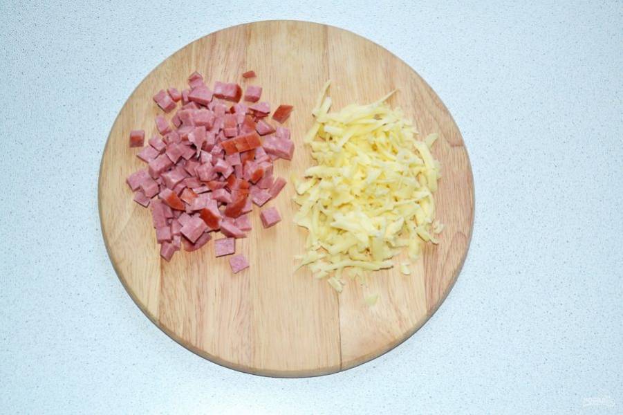Колбасу нарежьте небольшими кубиками, а сыр натрите на терке.