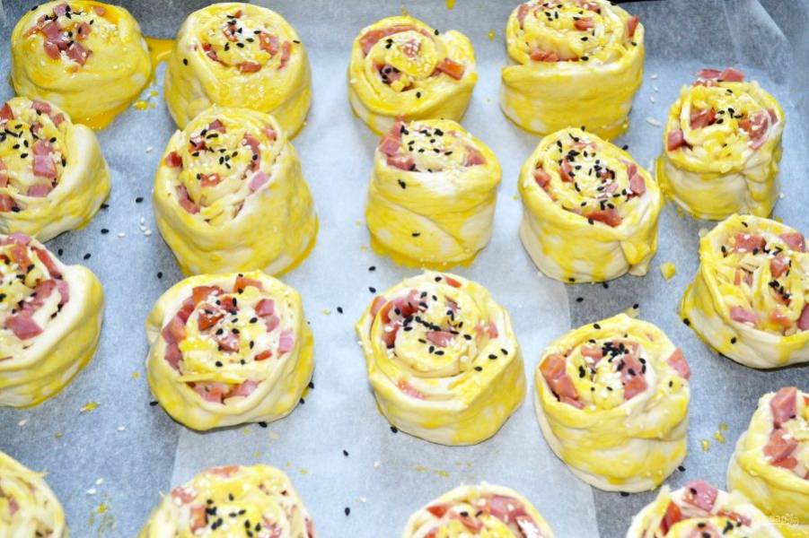 Смажьте булочки взбитым желтком и по желанию присыпьте кунжутом или сушеными травами. Отправьте в разогретую до 190 градусов духовку.