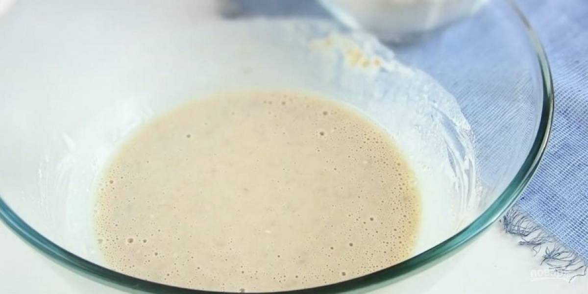 1. Теплое молоко смешайте с сахаром, дрожжами и 3 ст. ложками муки. Оставьте в теплом месте на 10-15 минут. Добавьте яйца, растопленное остывшее сливочное масло и перемешайте.