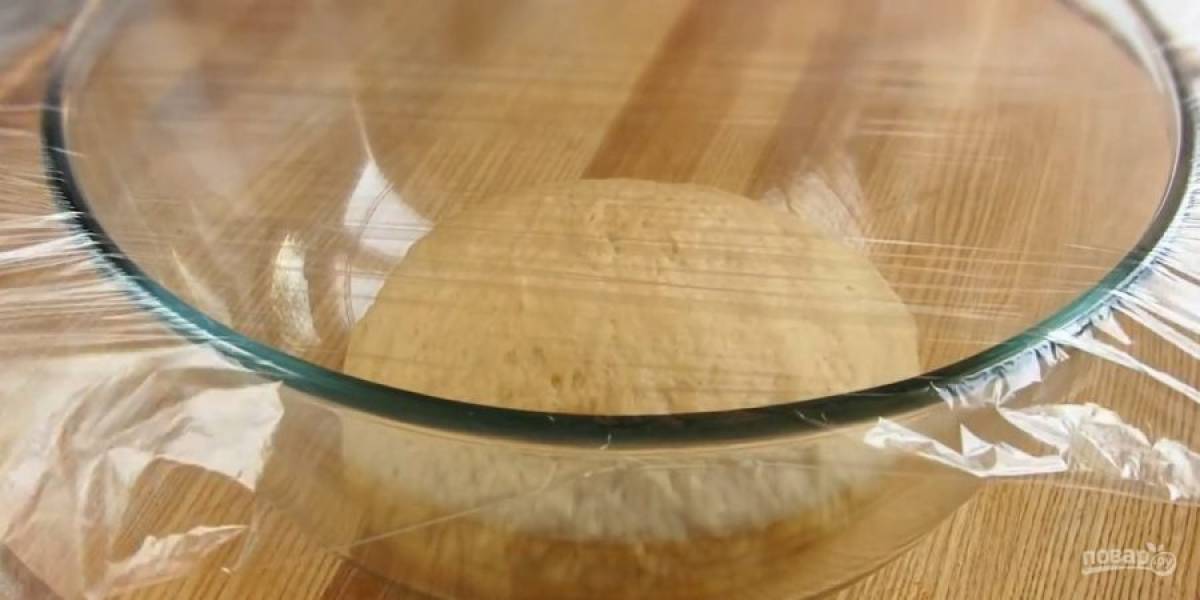 2. Добавьте просеянную муку и ложкой вымесите тесто. Переложите массу на присыпанную мукой поверхность и замесите мягкое тесто. Переложите тесто в смазанную растительным маслом миску, накройте пленкой и оставьте в теплом месте на 1 час.