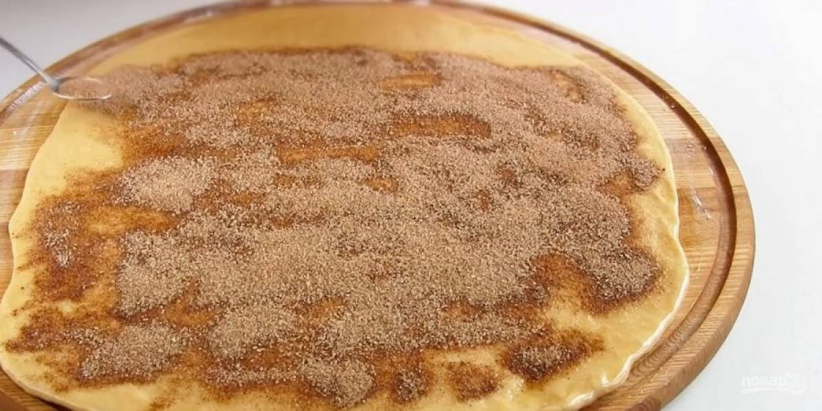 3. Для начинки смешайте корицу, сахар и ванильный сахар. Тесто обомните и раскатайте в пласт толщиной 1 см. Смажьте тесто растопленным сливочным маслом, посыпьте начинкой из корицы и сверните в рулет.