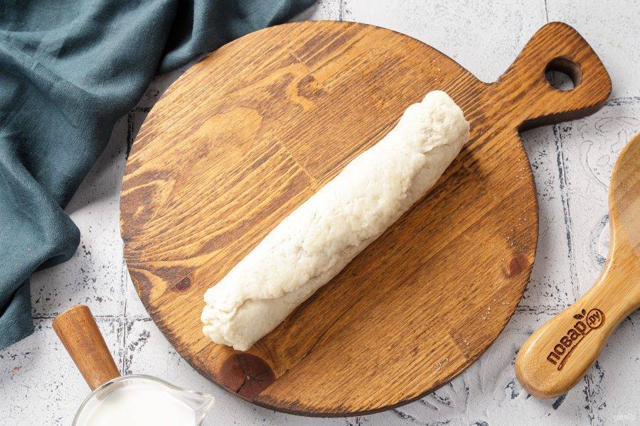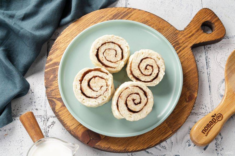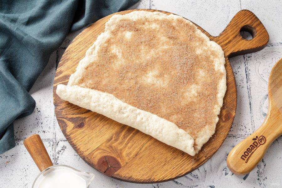 Выложите тесто на доску, присыпанную мукой и еще немного помесите его. Затем раскатайте скалкой в длинный пласт, шириной около 10 см. Смешайте сахар с корицей. Посыпьте смесью пласт теста. Скатайте тесто в рулет.