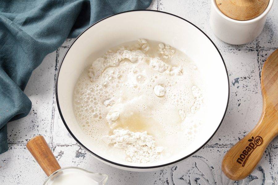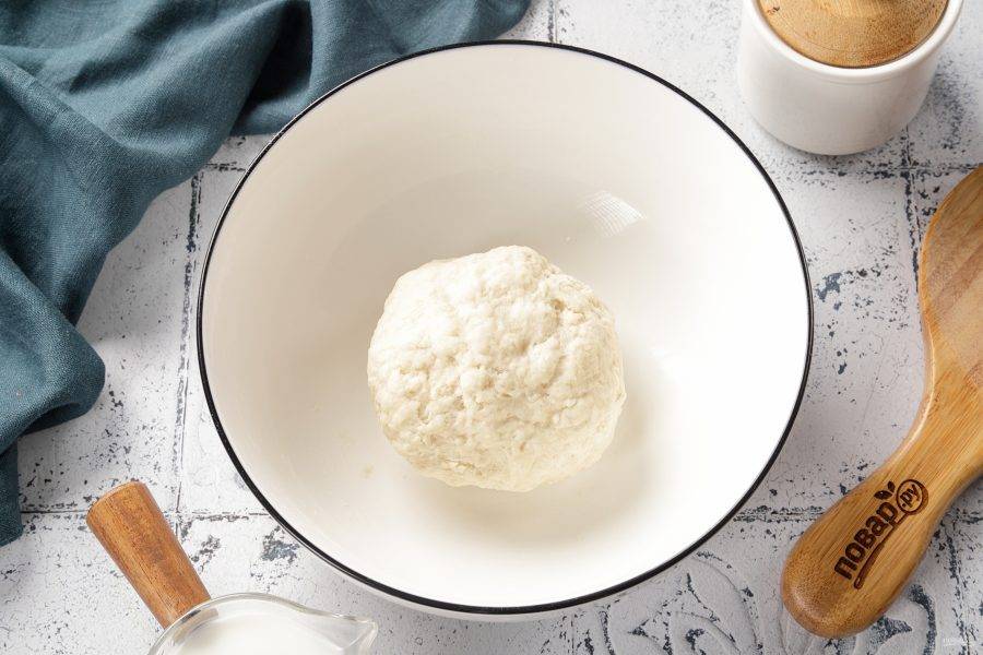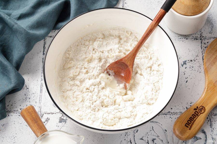 Начните замешивать тесто, добавив для начала три столовые ложки воды.
