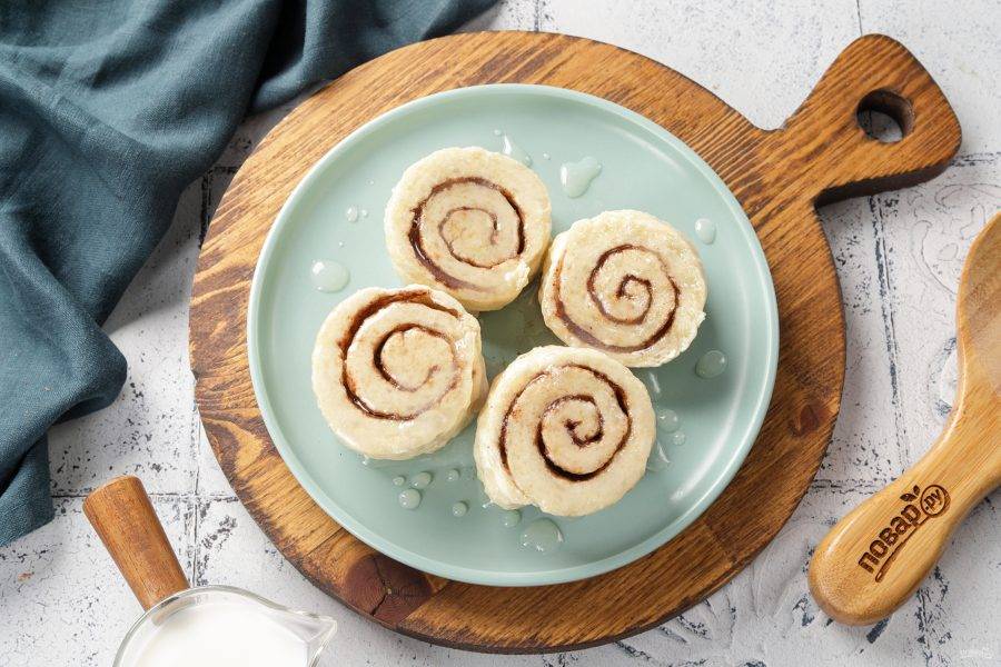 Полейте разрезанные или целые булочки сверху глазурью. Для приготовления глазури добавьте в сахарную пудру немного воды или молока и хорошенько размешайте до однородности. Булочки с корицей в микроволновке готовы.