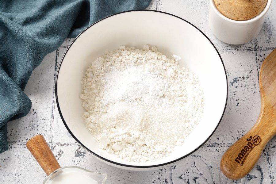 В глубокой миске соедините просеянную муку, соль и разрыхлитель.