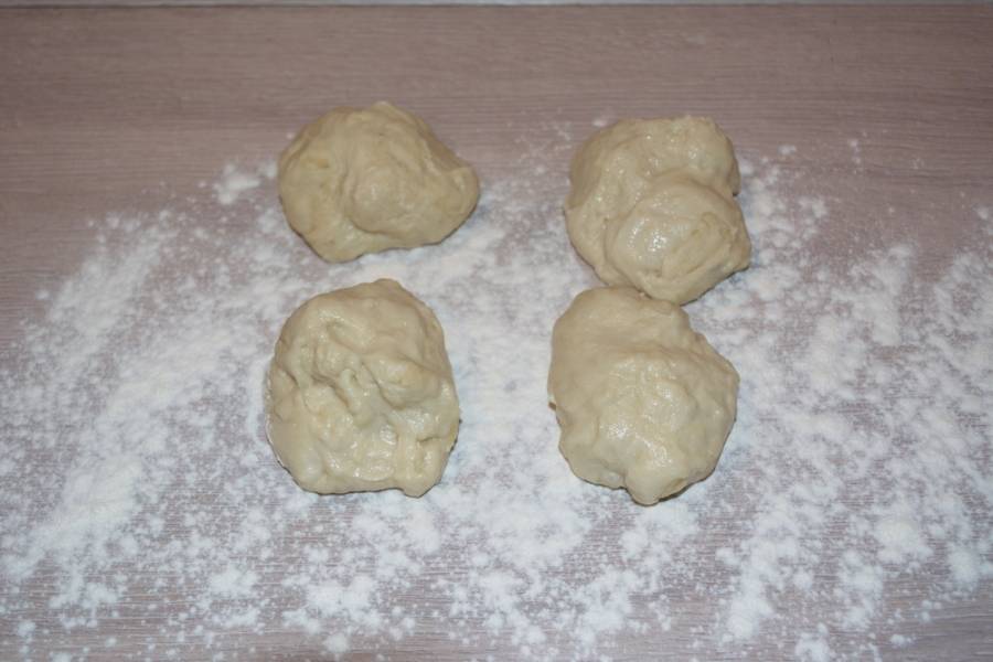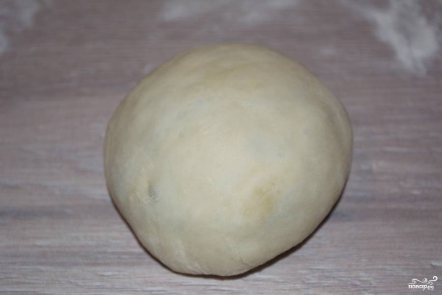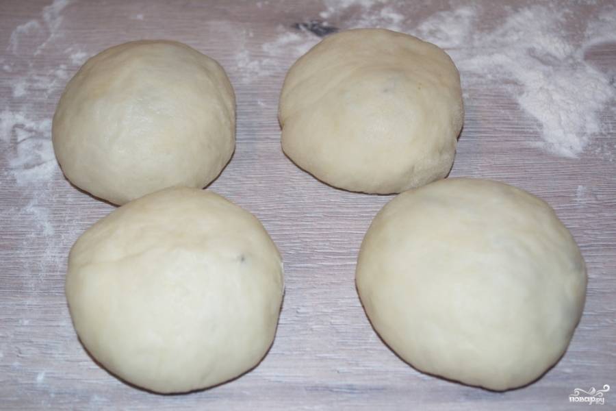Начинку охладите. Достаньте тесто. Разделите его на несколько кусочков. Стол присыпьте мукой. Каждый кусочек теста прижмите руками.
