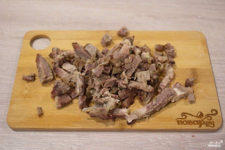 Мясо нарезаем на небольшие кусочки. Я использую ливер. Тут у меня немного свиного языка и отварная свинина.