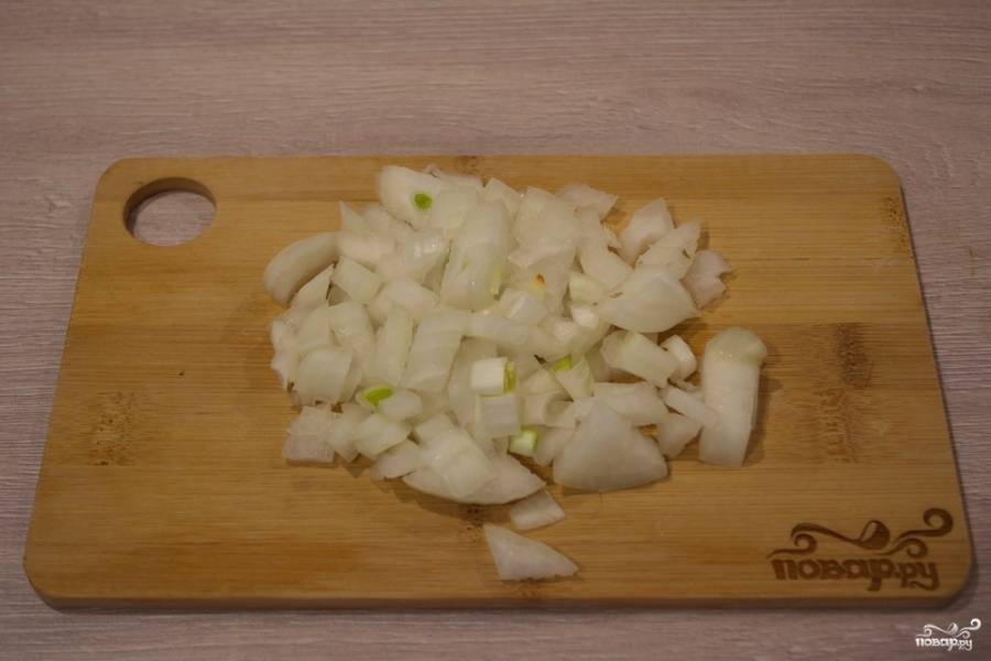 Пока тесто готовится, приготовим начинку. Репчатый лук нарезаем небольшими кубиками и обжариваем на растительном масле.