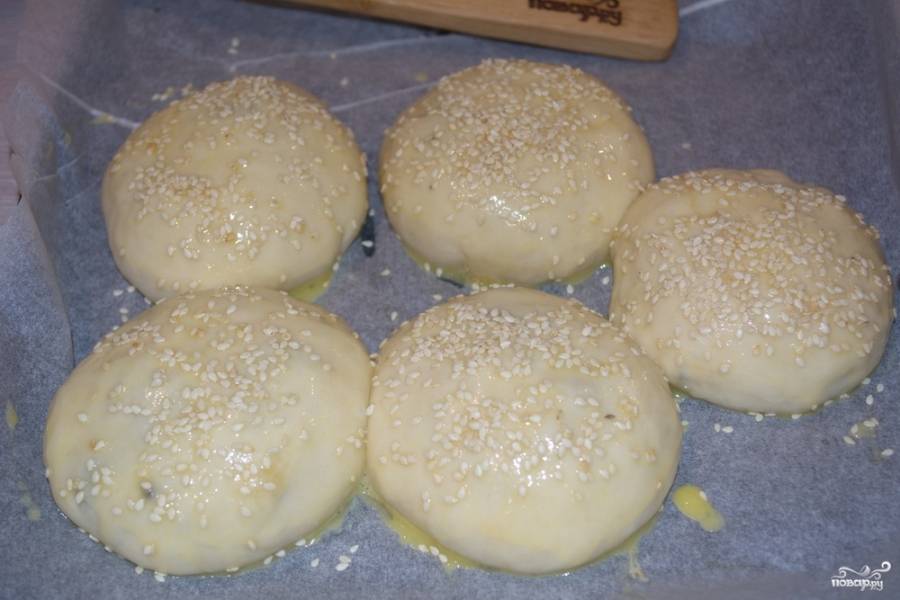 Булочки перед выпечкой нужно смазать взбитым яйцом. Я еще люблю посыпать их кунжутом.