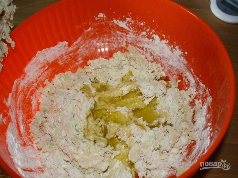 2. Перемешивая все вилкой, добавьте масло и замесите тесто.