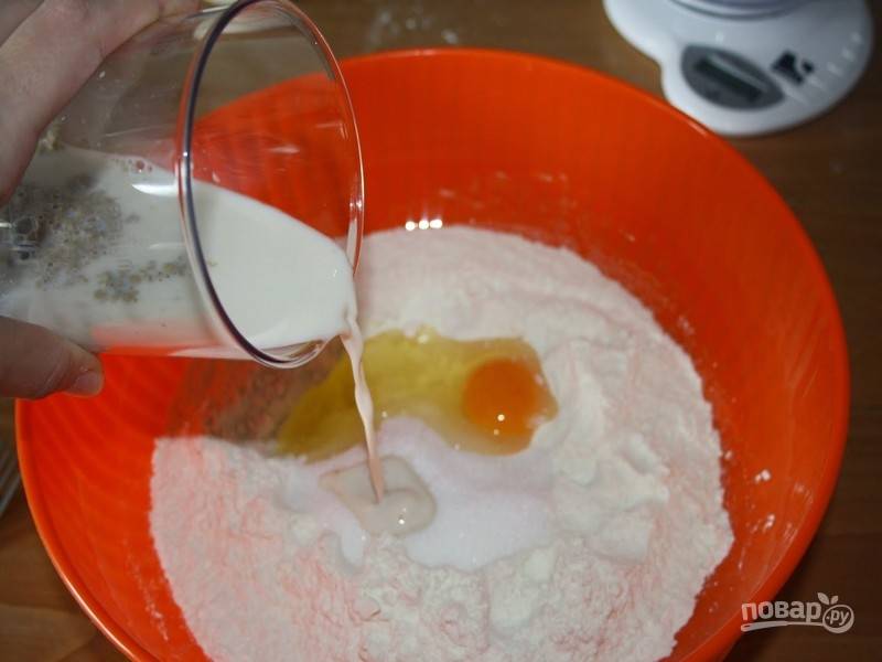 1. В теплом молоке растворите дрожжи. В большую миску просейте муку, добавьте соль, сахар и яйцо, затем влейте молоко с дрожжами.