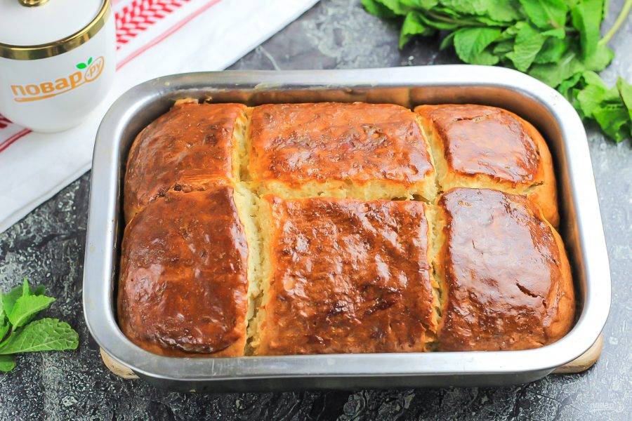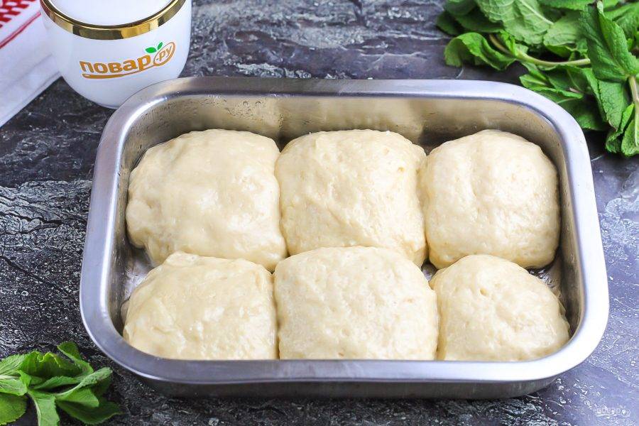 Смажьте форму маслом и разделите тесто на равные части. Скатайте каждую из них в колобок и выложите в форму. Накройте форму полотенцем и оставьте заготовки для расстойки на 30-60 минут в теплом месте без сквозняков.