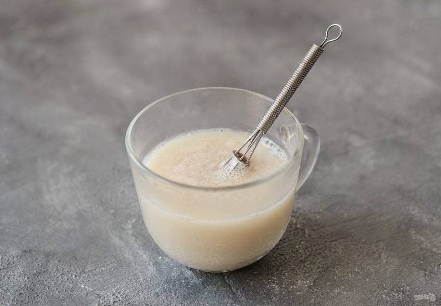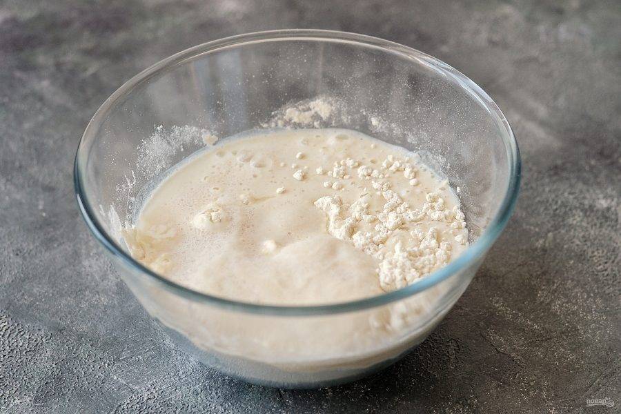 Разведите в теплой воде дрожжи и 1/2 ст.л. ложку сахара. Оставьте на 10 минут.