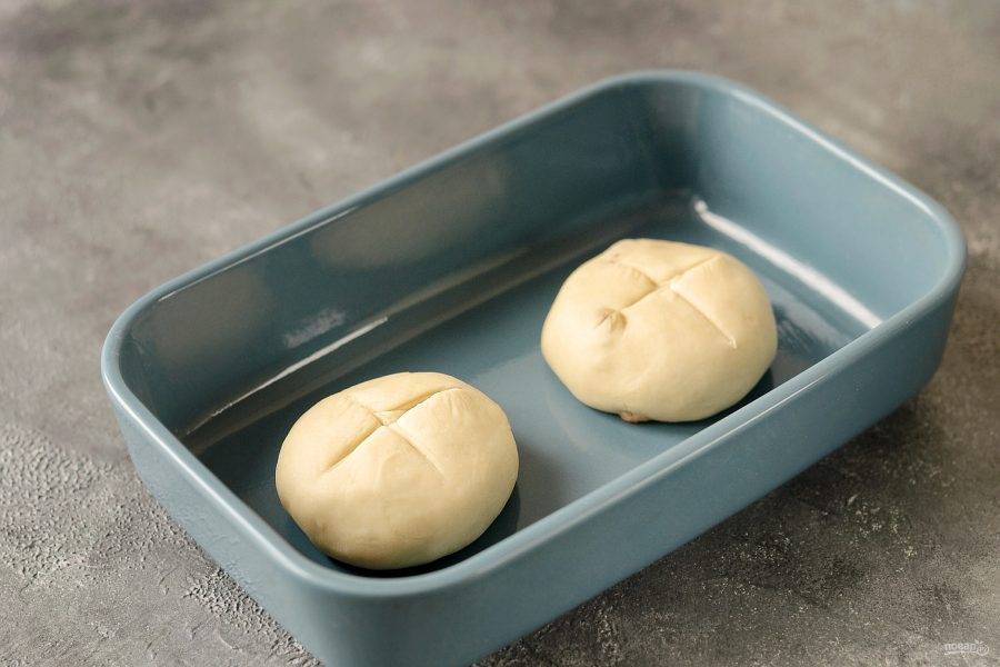 Разделите тесто на 4 булочки. Прижмите их ножом, сделайте надрезы крест-накрест. Накройте и уберите на полчаса подняться.