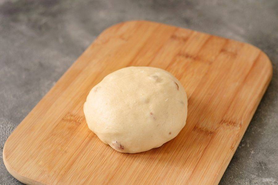 Тесто обомните. Присыпьте поверхность мукой, добавьте 2 ст.л. ароматизированного масла и промытый изюм. Выместите.