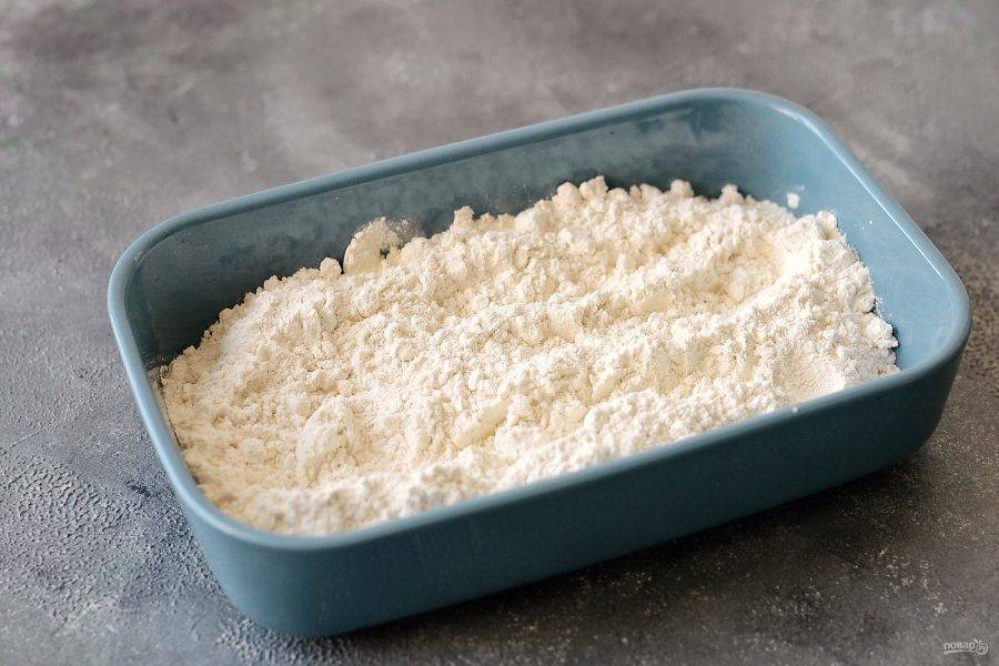 Муку просейте и поставьте в заранее разогретую до 150 градусов духовку на 2-3 минуты.
