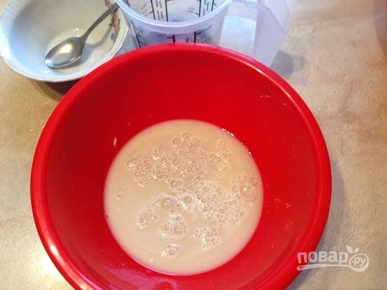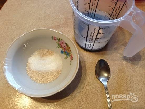 1. В небольшой мисочке смешаем сухие дрожжи и сахар. Вода нам нужна теплая. Добавим немножко воды к дрожжам и растворим их.