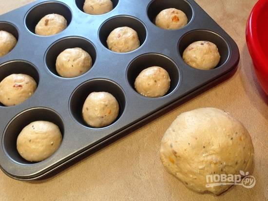 9. В этот раз я оставила примерно 1/4 часть теста для приготовления другого блюда - ведь из этого теста получается отличная основа для пиццы. Оставшееся тесто поделила на 12 частей, сформировала шарики-булочки и выкладываем в формочки. Тесто заполняет формочки чуть меньше, чем на половину.