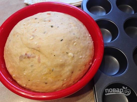 8. Тесто подошло, обминаем его. Эти булочки я пеку в формах для кексов, они получаются аккуратные и красивые.