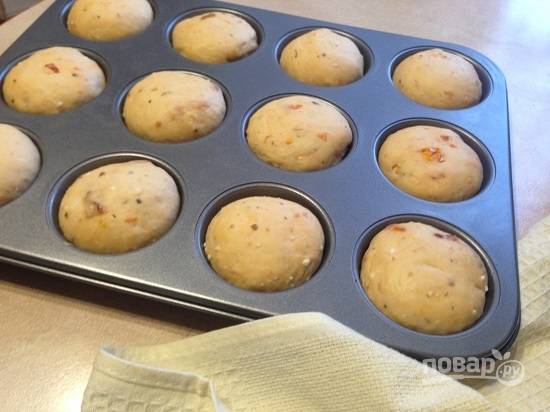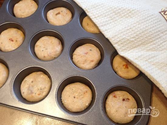 10. Прижмем шарики теста в формочках, накрываем полотенцем и ставим подходить еще минут на 40-50.