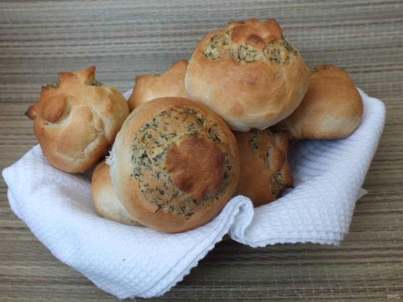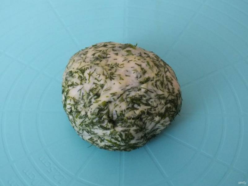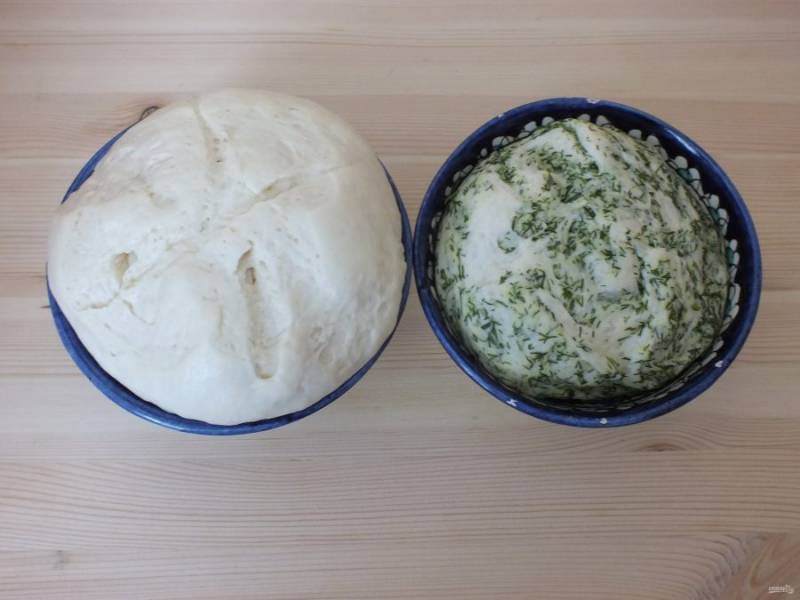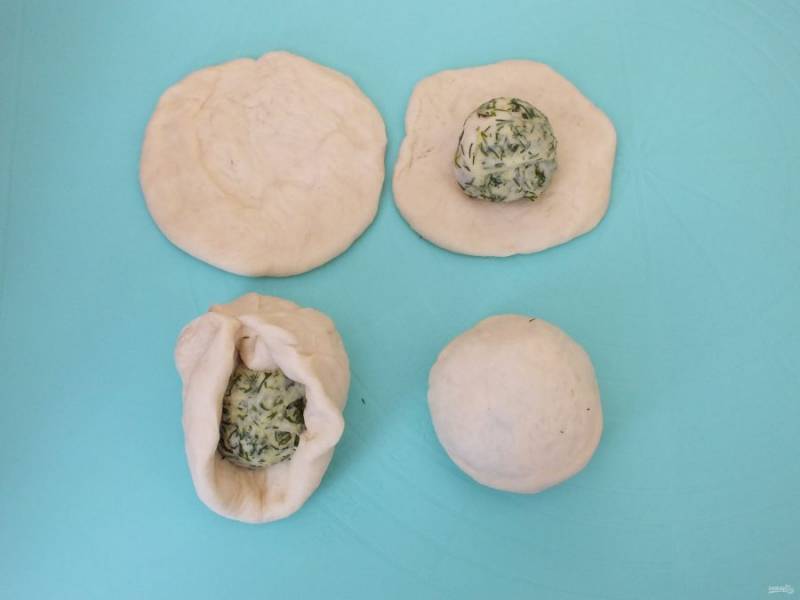 Формовка булочек. На ладони расплющите белое тесто в лепешку, на него выложите укропный шарик и защипните края к центру. Переверните и слегка прокатайте на рабочей поверхности.