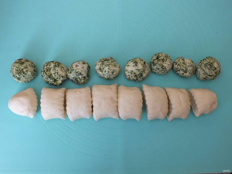 Из каждой части скатайте жгут и разделите на 8 частей. Из укропного теста скатайте шарики.