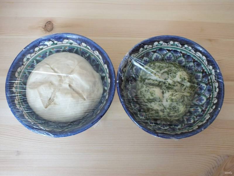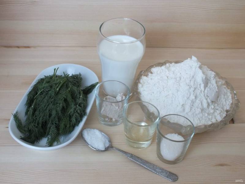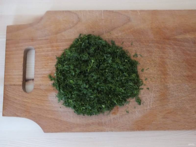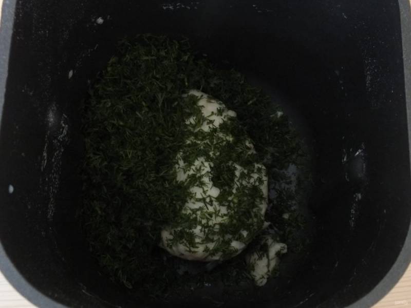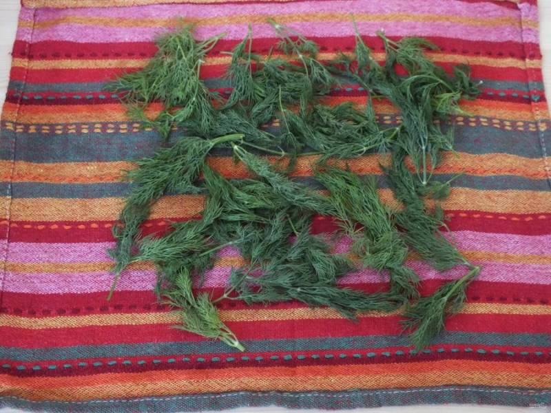 Пока тесто замешивается, укроп необходимо помыть и промокнуть полотенцем. Если вы замешиваете ручным способом, вам этот шаг необходимо сделать заранее.