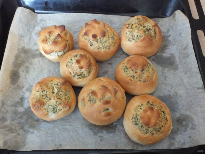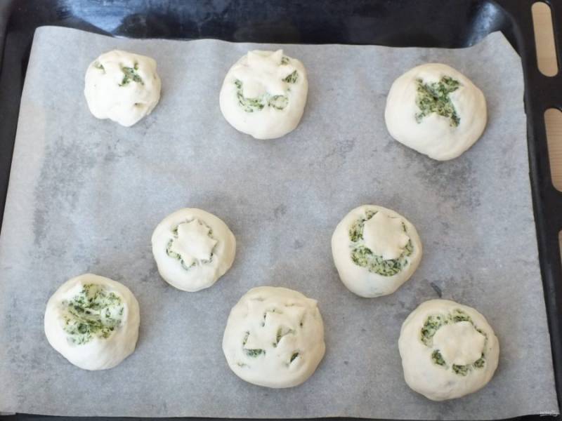 Булочки выложите на противень и оставьте для расстойки на 25 минут. Включите духовку на 180 градусов.