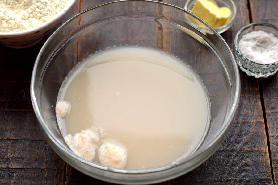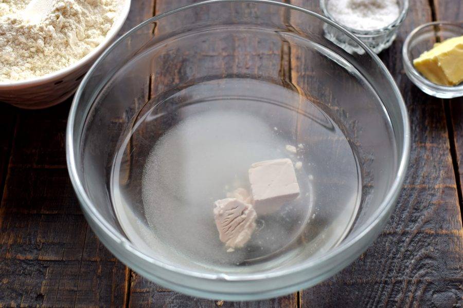 Воду нагрейте до теплого состояния, залейте прессованные дрожжи, добавьте сахар.