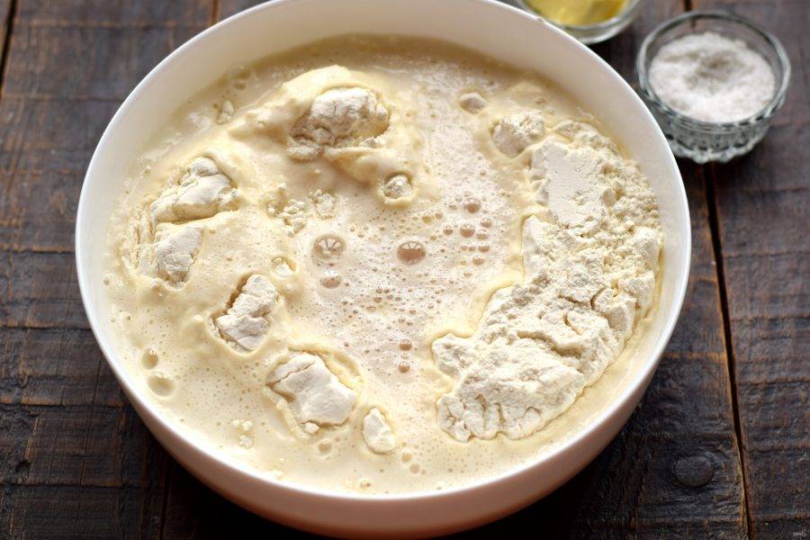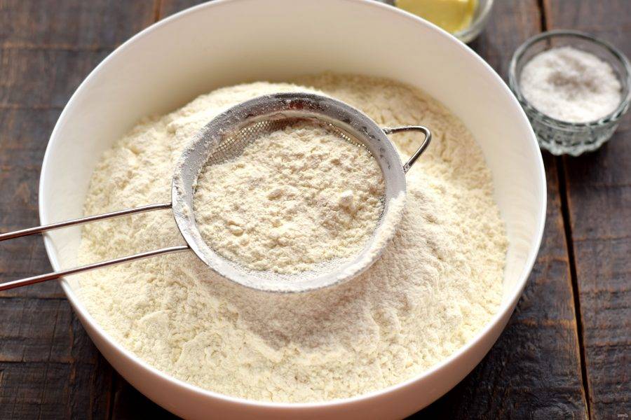 Параллельно просейте через сито необходимое количество муки, лучше это сделать дважды. Просеянная мука сделает выпечку мягче. В муку добавите немного соли.