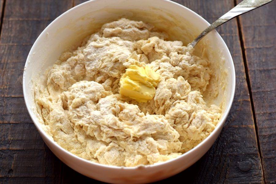 Когда мука увлажнится, добавьте мягкое сливочное масло, перемешиванием соедините его с тестом.