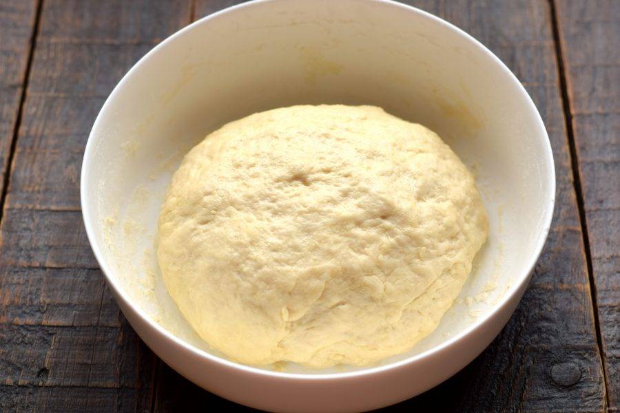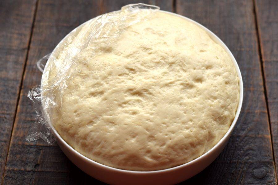 Тесто слегка смажьте растительным маслом, чтобы масса не прилипала к посуде, выложите в глубокую емкость, прикройте пищевой пленкой, так оно не обветрится. Отставьте тесто на 1 час, чтобы оно подошло. Спустя время тесто перемешайте, отставьте еще на 30 минут в сторону для повторного увеличения в объеме.