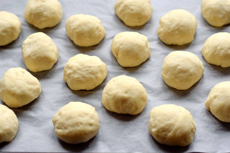 Через час тесто перемешайте, разделите на равные части объемом около 50 грамм. Должно получиться 16-18 штук. Каждый экземпляр скатайте в круглый шар, выложите на противень, застеленный пергаментной бумагой. Шарики выкладывайте на расстоянии друг от друга, поскольку при выпечке они увеличатся в размере. Заготовки накройте полотенцем, оставьте в покое на 25 минут, за это время шарики должны немного подняться.