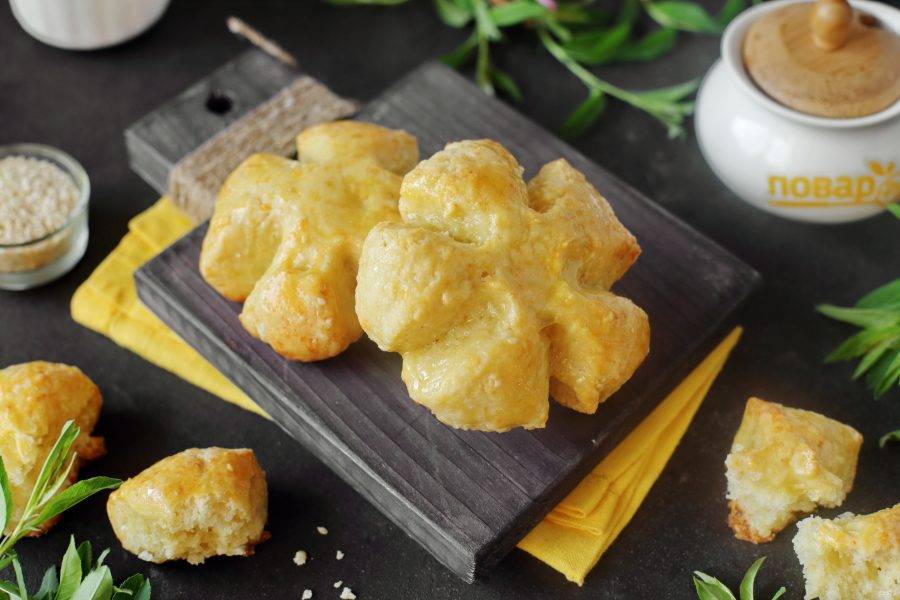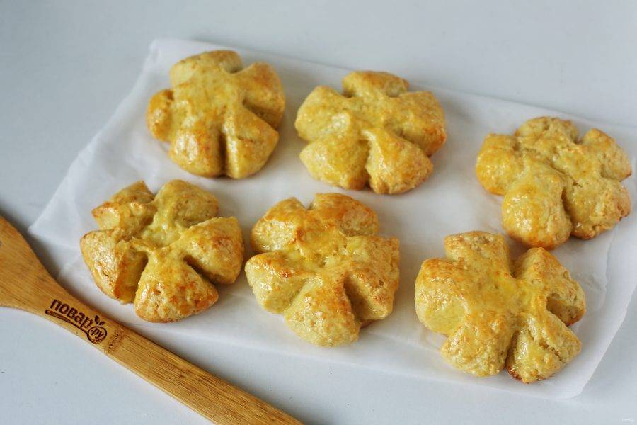 Разделите тесто на 6 частей, сформируйте шарики и переложите их на противень, застеленный пергаментом. Сделайте по бокам надрезы кухонными ножницами, как показано на фото, и слегка прижмите середину. Получится своеобразный цветок. Смажьте верх желтком и запекайте в духовке при температуре 180 градусов около 25-30 минут.