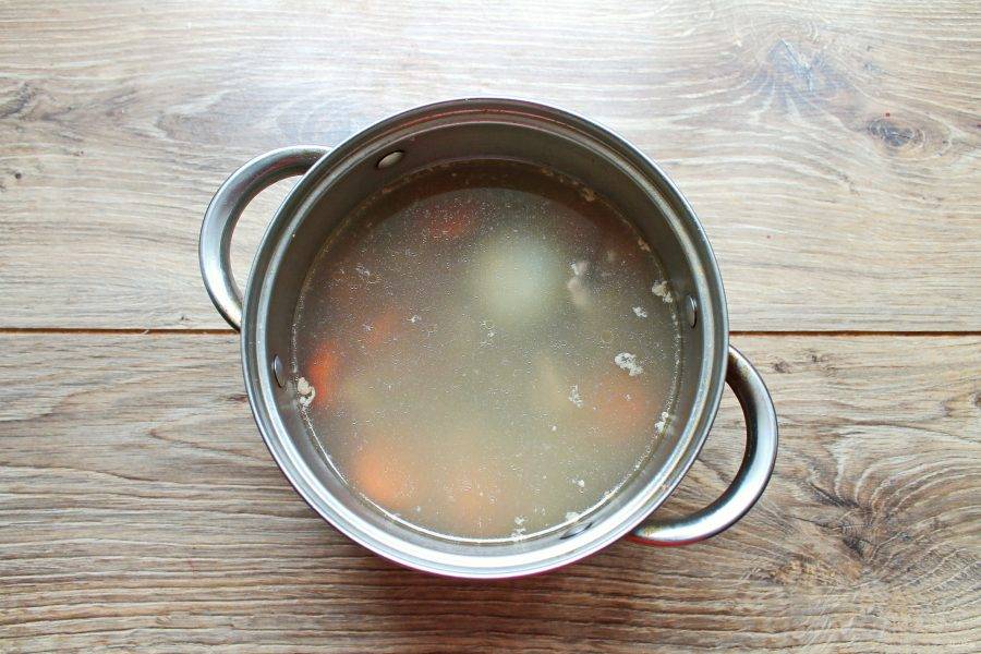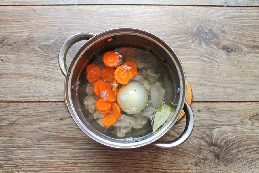 Морковь почистите и порежьте кружочками. Добавьте морковь в кастрюлю с бульоном.