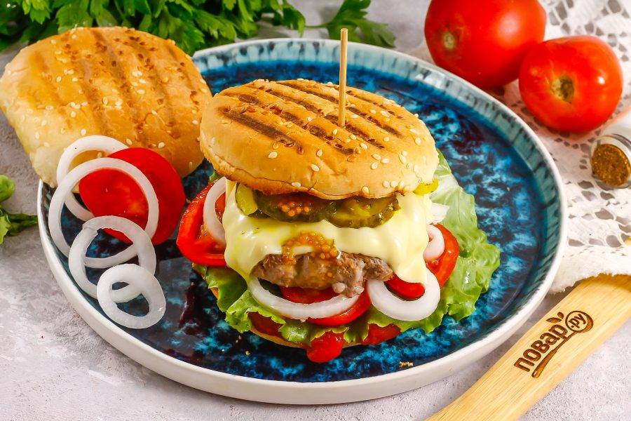 Накройте бургер верхушкой булочки и закрепите деревянной шпажкой. Подайте к столу горячим.