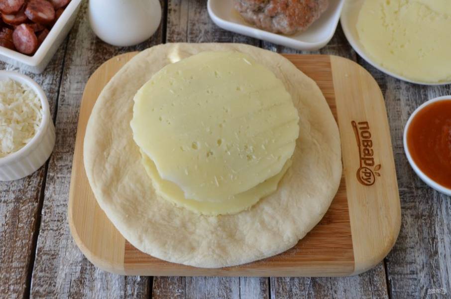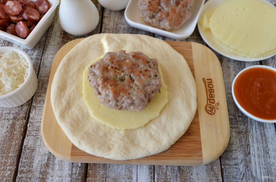 На тесто положите колечко моцареллы, сверху - котлета.