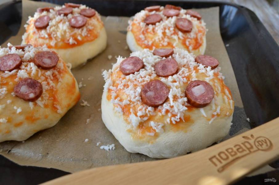 Застелите противень бумагой, смажьте ее маслом. На расстоянии друг от друга положите бургеры, сверху смажьте каждый томатным соусом, посыпьте тертой моцареллой, и украсьте колечками сосиски. Отправьте в духовку на 20-25 минут, температура - 200 градусов. Время регулируйте, духовки ведь разные.
