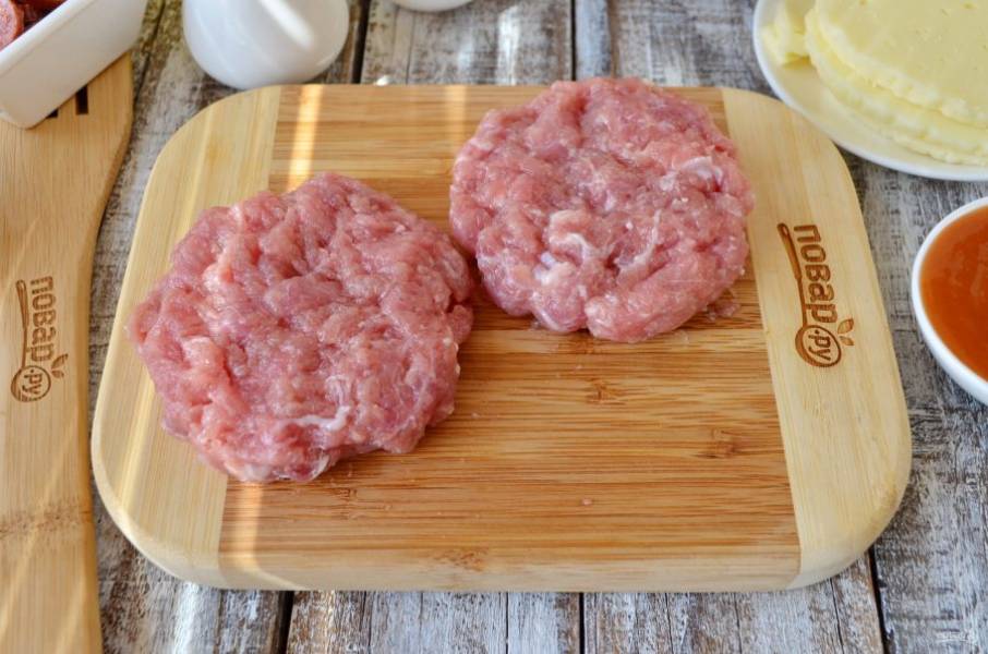 Свино-говяжий фарш посолите, поперчите и приправьте любимыми специями, я положила немного прованских трав. Разделите на 4 части, каждая котлетка - 100 г, сформуйте и обжарьте на растительном масле (на сковороде) до готовности.