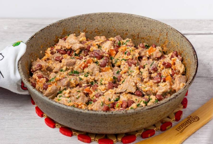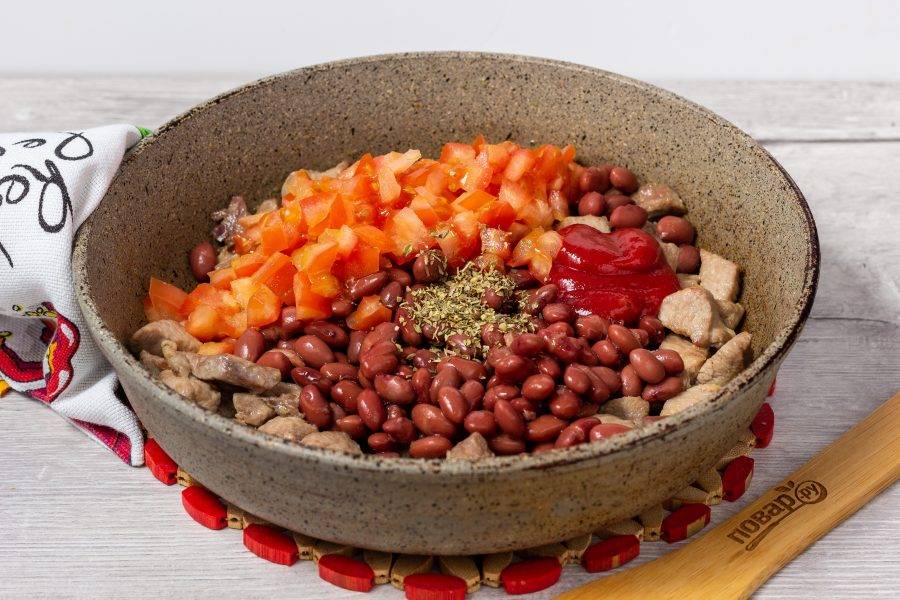 Добавьте нарезанный кубиками помидор, фасоль, томатную пасту, травы. Аккуратно все перемешайте, потушите 3-4 минуты.